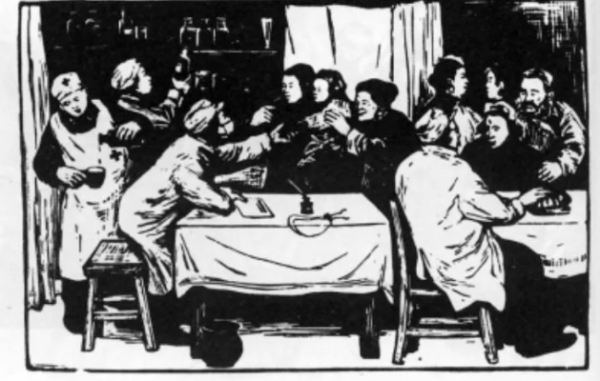 延安鲁艺美术系教员彦涵版画《乡村诊所》(1944年)