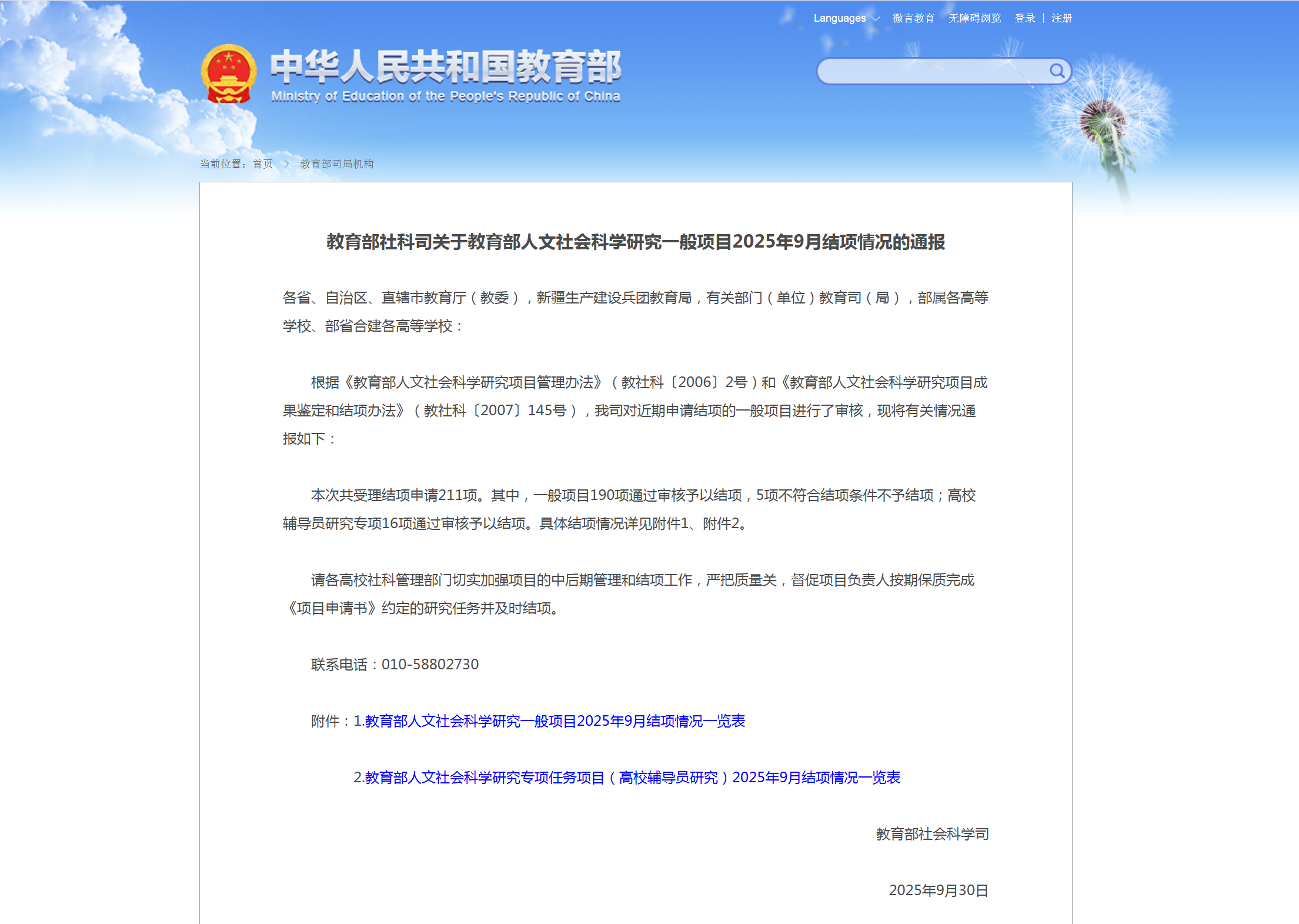 教育部社科司关于教育部人文社会科学研究一般项目2025年9月结项情况的通报