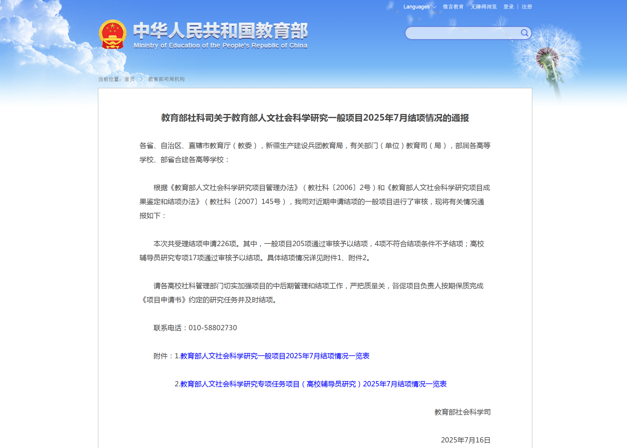 教育部社科司关于教育部人文社会科学研究一般项目2025年7月结项情况的通报
